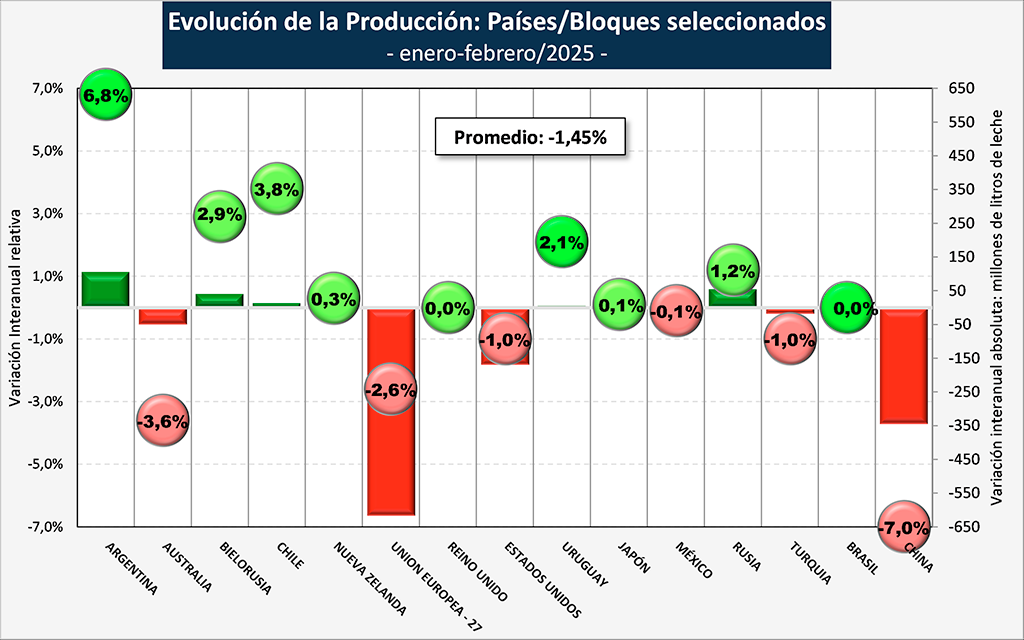 En el cuadro siguiente se toma un grupo seleccionado de los principales países que representan algo más del 55% de la producción mundial de leche de vaca, en el cual se puede observar una baja de la producción del 1,45%, para el primer bimestre del año 2025 respecto a igual período del año 2024.