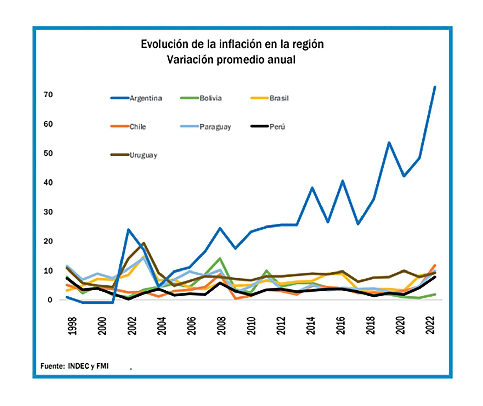 El documento incluye además varios gráficos, elaborados en base a datos oficiales y de organismos internacionales, en los que evidencia los muy malos resultados, en términos absolutos, y más aún en la comparación internacional, en materia de evolución del PBI por habitante, los constantes y fortísimos déficits fiscales y la apabullante inflación argentina, muy por encima de las que hace años registran los principales vecinos de la región.