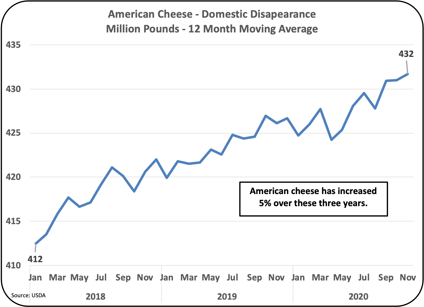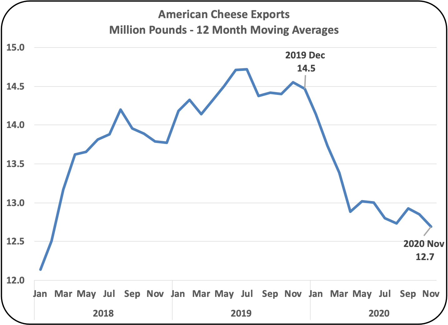Los inventarios de queso son razonables. La producción de Cheddar está alcanzando máximos históricos. El aumento de la producción supera la baja. Las exportaciones a México, el mayor cliente de EE.UU., seguirán probablemente deprimidas en 2021. Esto podría llevar a un cierto deslizamiento del precio.