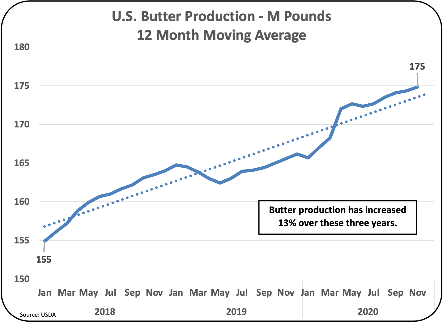 El precio de la mantequilla determina el precio que todos los productores de la Orden Federal de Comercialización de la Leche obtienen por la grasa butírica. Por lo tanto, el precio de la mantequilla es muy importante. Existe una correlación inversa entre los inventarios de mantequilla y los precios de la misma. En los últimos años, los precios de la mantequilla aumentaron hasta niveles récord porque los inventarios eran escasos. En 2020 los niveles de inventarios aumentaron y los precios de la mantequilla cayeron a niveles más típicos.