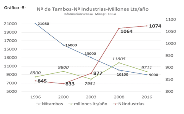 Pero la concentración de la que les hablaba al principio no está en los procesadores, sino en los productores. De los más de 30.000 tambos que había en 1988, hoy no llegamos a 10.000. Y como la producción no creció significativamente, esto significa que menos tambos concentran el mismo volumen. Hoy, un tambo promedio produce unos 3.000 litros de leche por día.